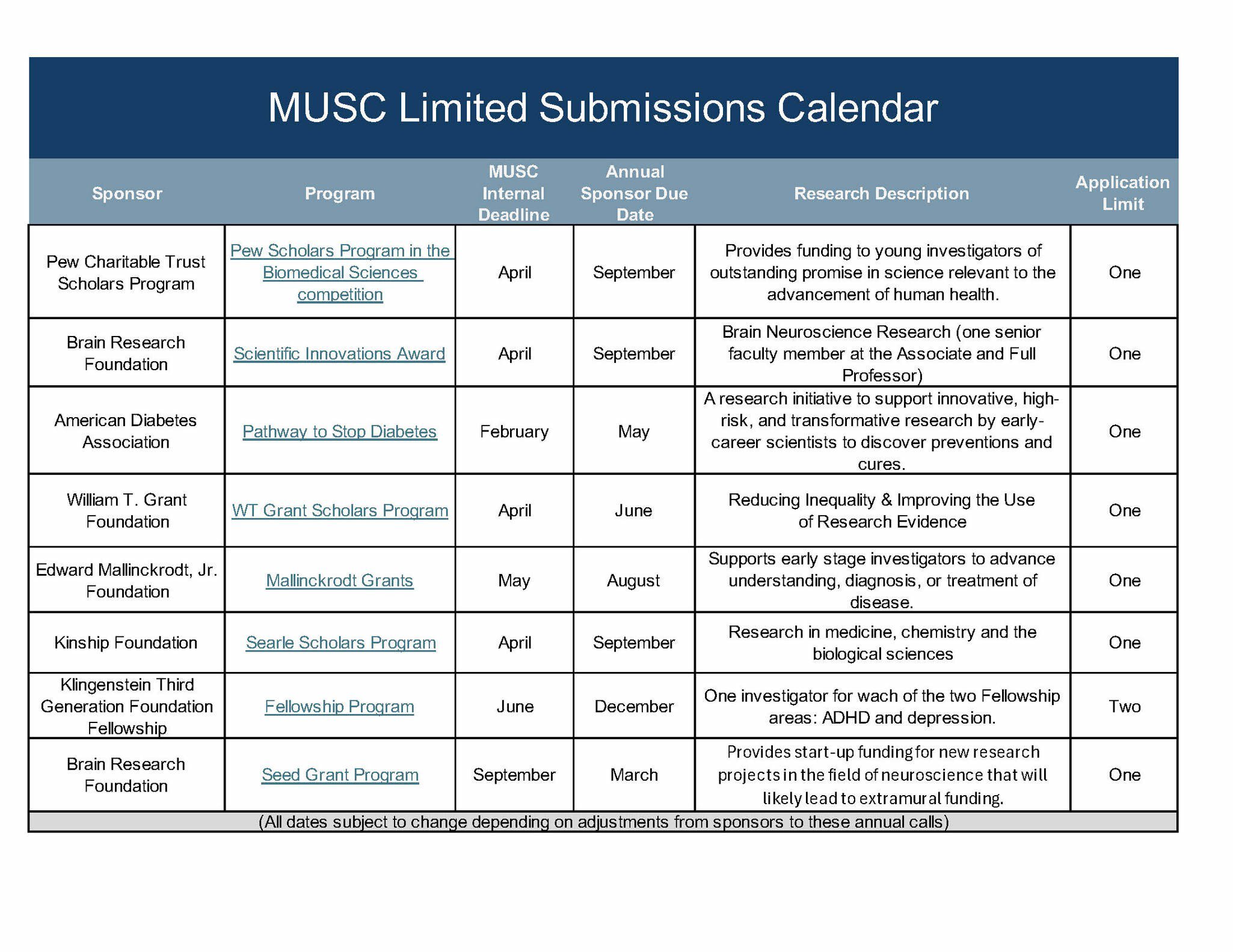 Limited submissions are funding opportunities in which the sponsor restricts the number of applications, proposals, or nominations that can be submitted on behalf of a single institution. MUSC assumes the responsibility for the screening of pre-applications/nominations to select the most competitive proposal that will be permitted to move forward for funding consideration.
